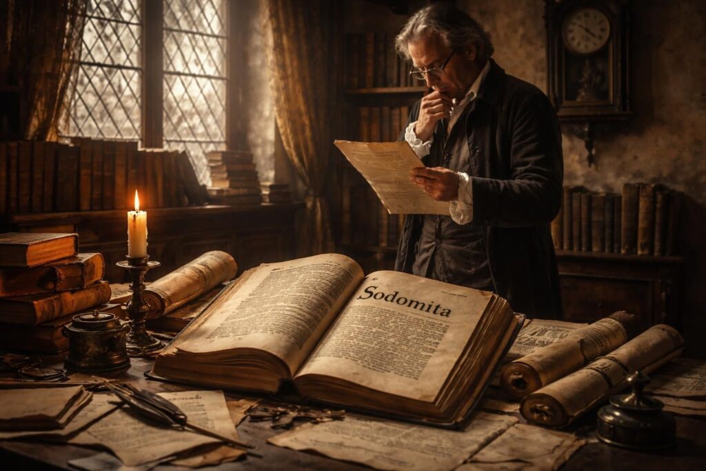 Le terme « sodomite » trouve son origine dans le mot latin Sodomita, qui désigne un habitant de Sodome, ville célèbre dans la Bible pour avoir été détruite en raison de ses pratiques immorales. Au départ, le terme était purement géographique, mais il a rapidement acquis une connotation péjorative. Dans le langage courant, un sodomite est celui qui pratique la sodomie, c’est-à-dire un rapport sexuel impliquant une pénétration anale, souvent entre personnes de même sexe.