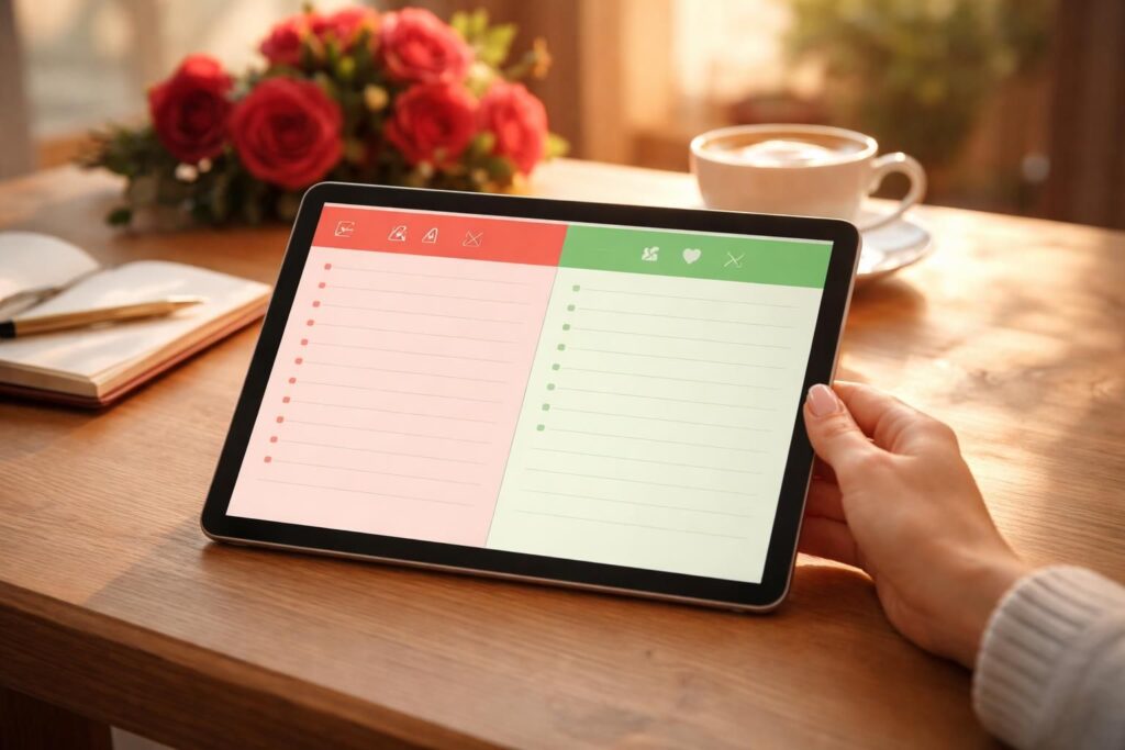 découvrez comment utiliser une tablette tactile pour noter facilement les 'red flags' et 'green flags' après un rendez-vous, afin de mieux analyser vos rencontres.